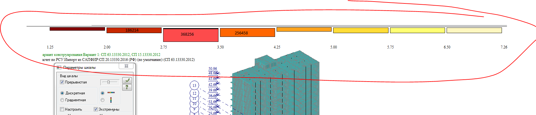 2. Предлагаю при отображении шкалы по коэффициентам запаса, делать толщину каждого диапазона различной, в зависимости от количества элементов, которые попадают в этот диапазон, и прописывать количество элементов внутри каждого отрезка. Это даст возможность видеть насколько рационально выполнен подбор сечений, арматуры. Можно будет увидеть самый "жирный" диапазон и оценить, "общий запас сооружения"