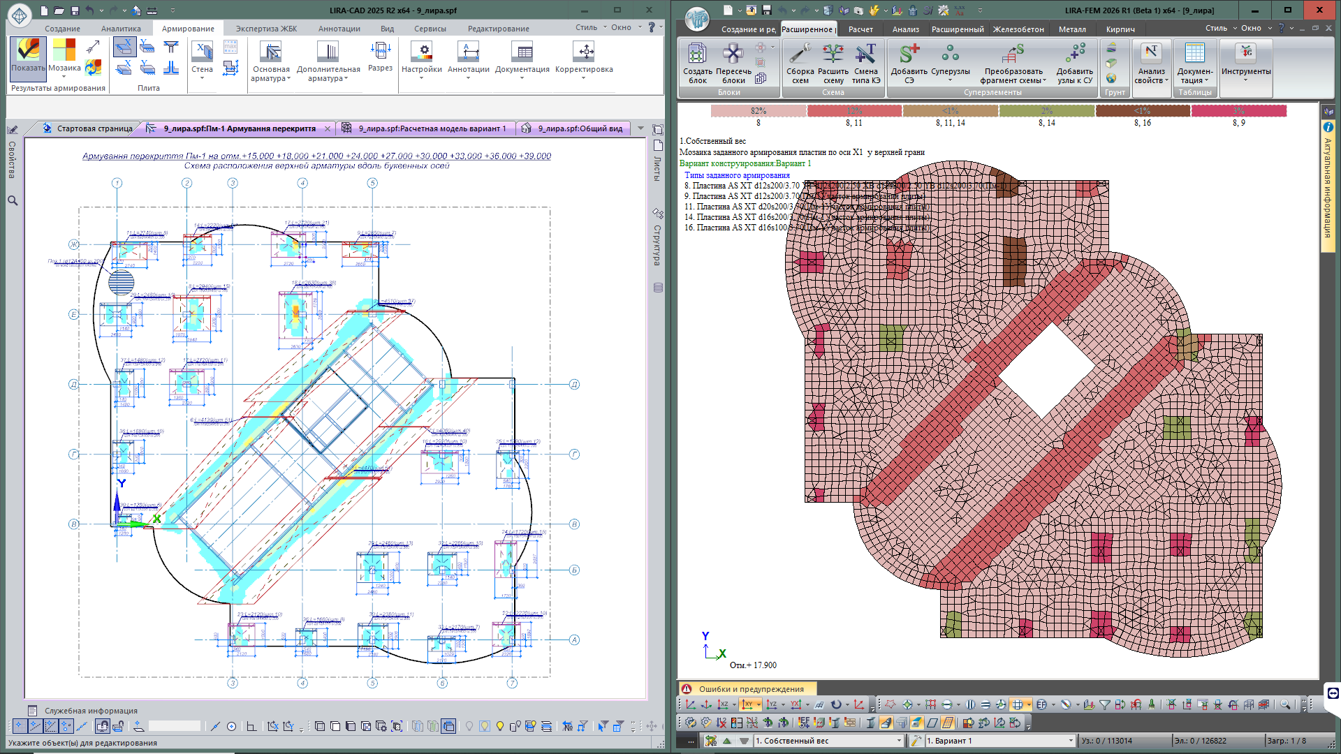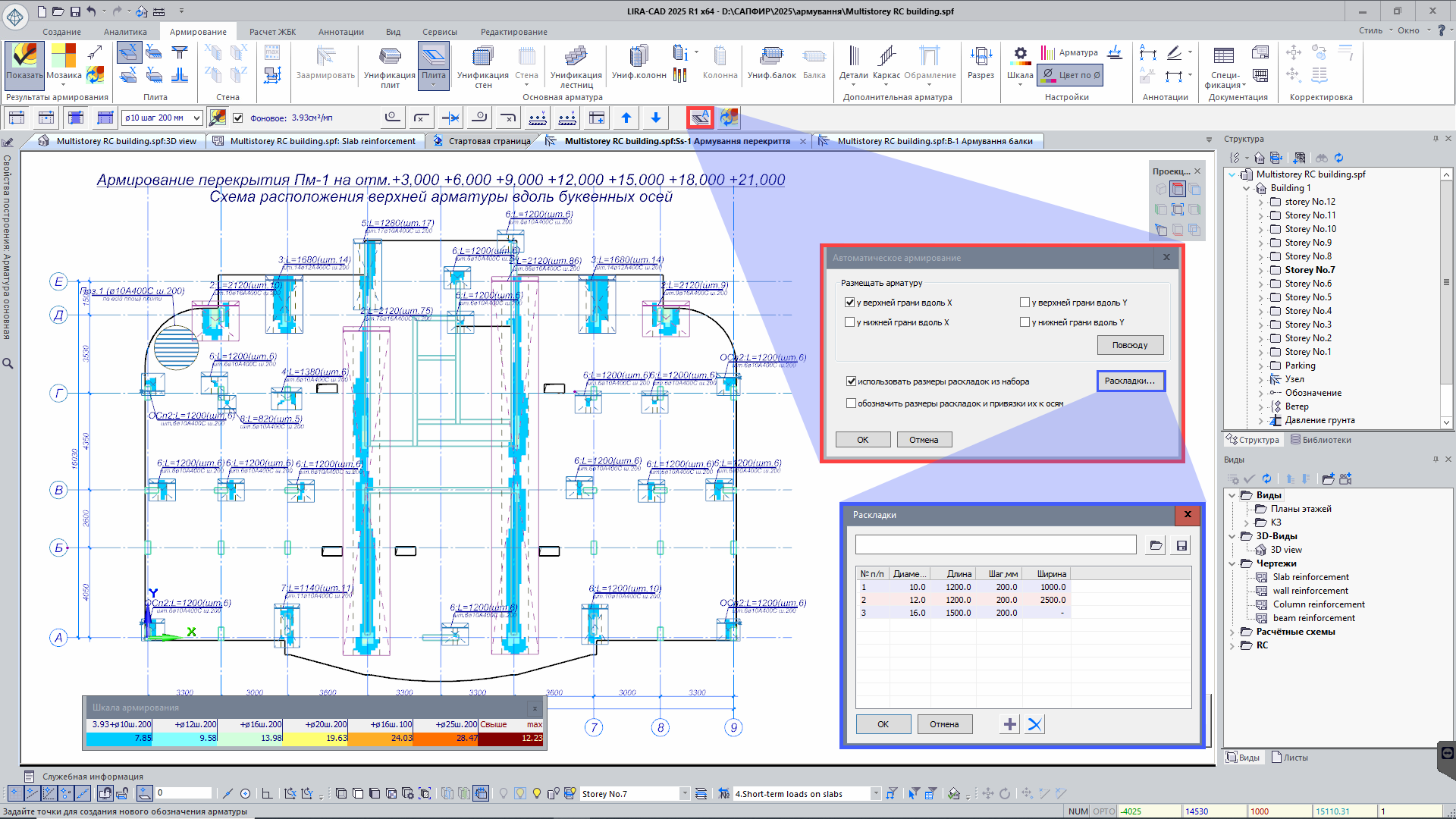Для модели армирования плит автоматически создаётся основное (фоновое) армирование с обозначением и выноской. На основе мозаики армирования можно раположить участки дополнительного армирования с учётом длины анкеровки. С помощью мозаик недоармирования и переармирования можно оценить оптимальность раскладки.