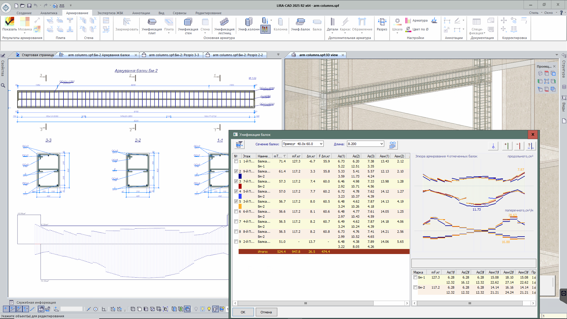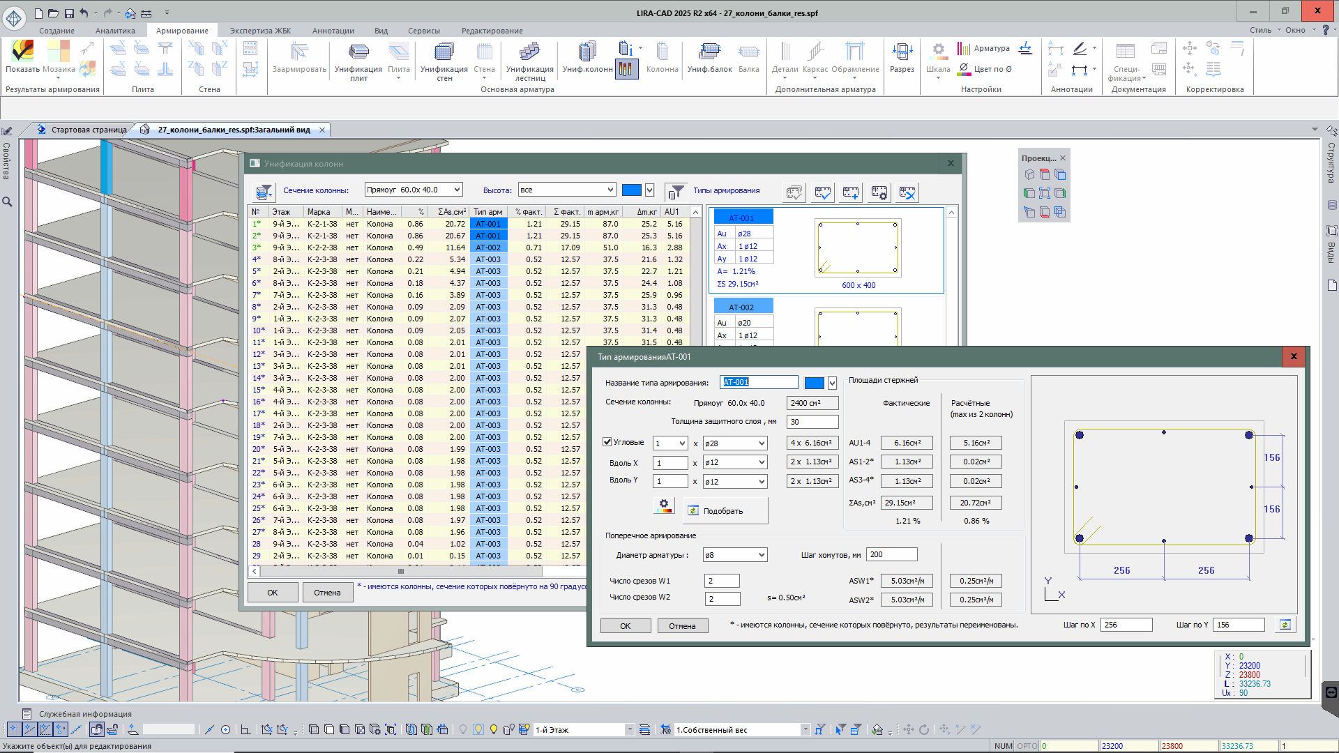 Армирование колонн выполняется на основе данных унификации. В таблице унификации колонны автоматически сортируются по убыванию процента и площади армирования, позволяя инженеру сразу видеть оптимальные решения.