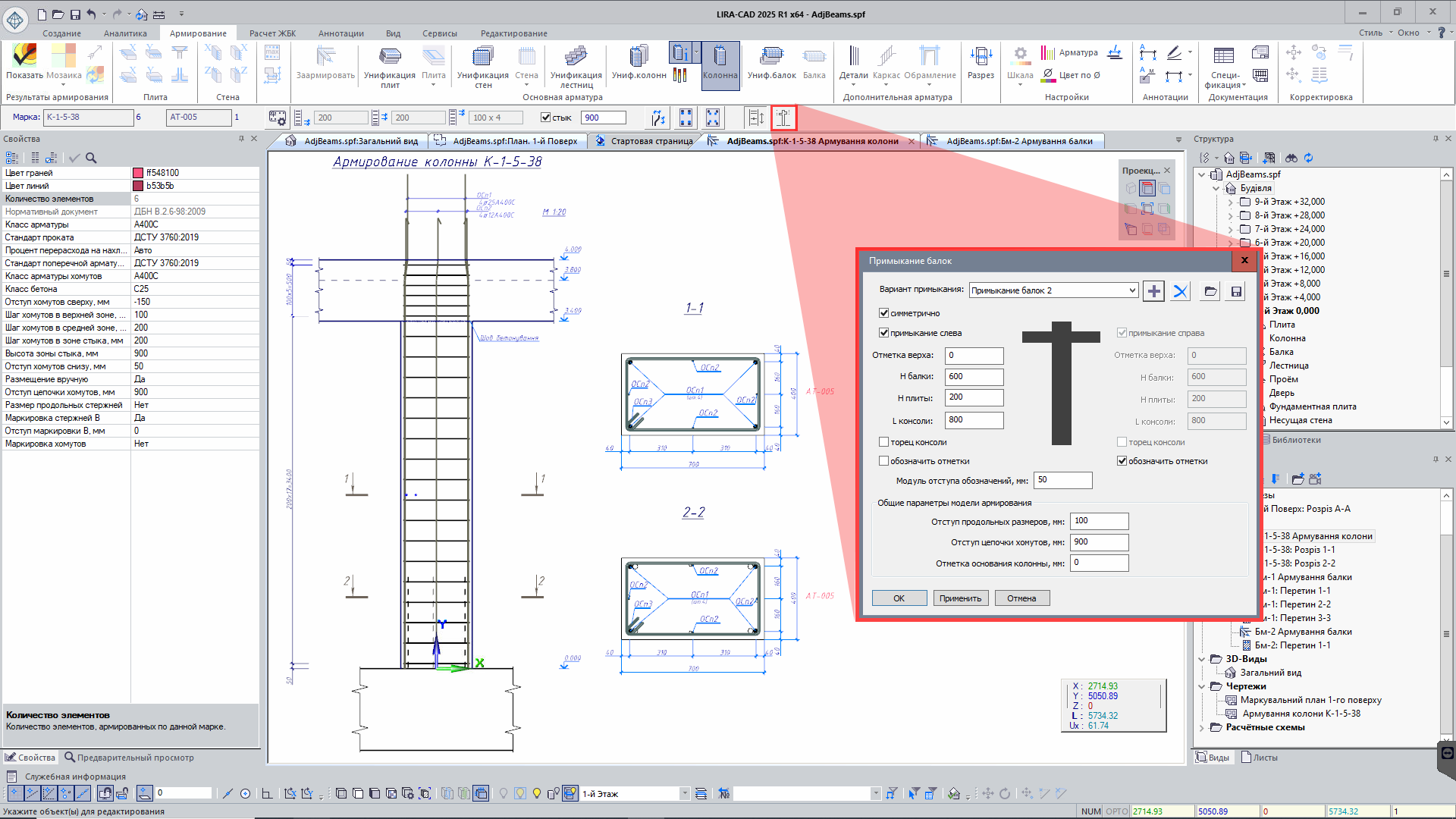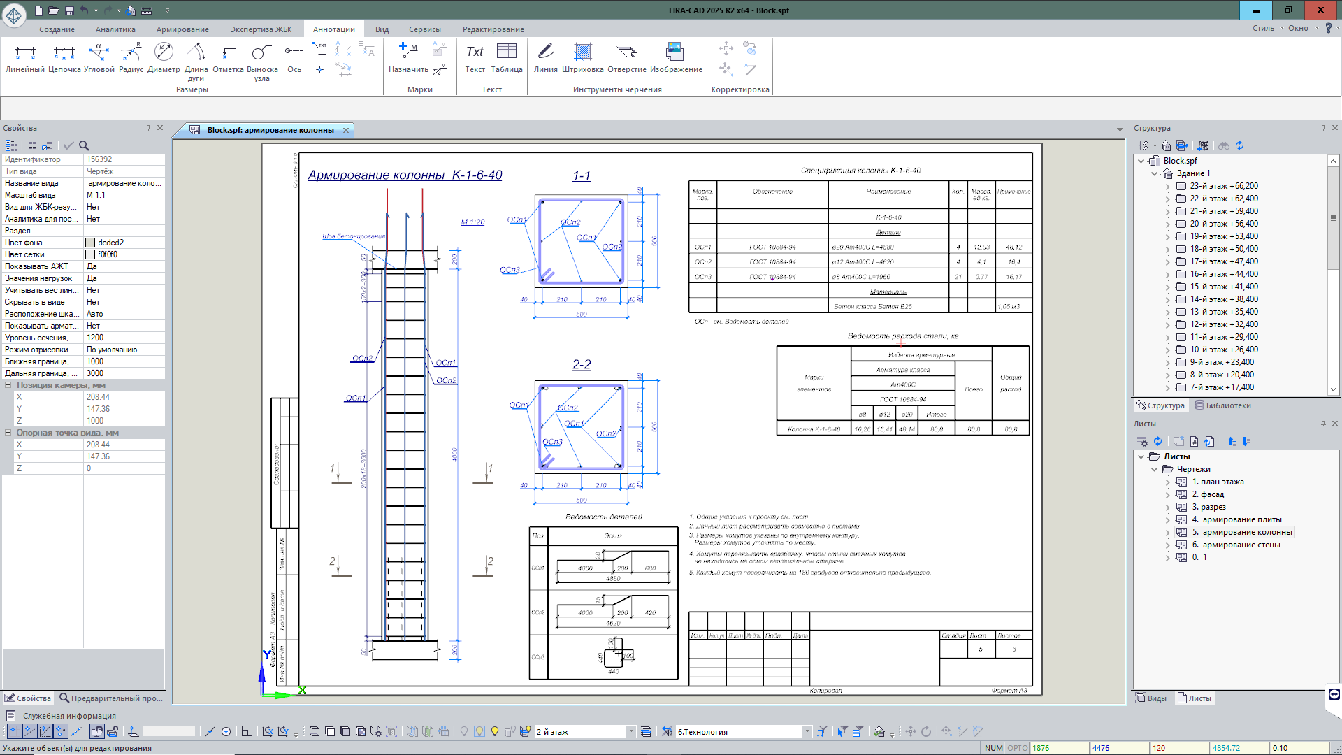 Далее программа в автоматическом режиме маркирует колонны по созданным типам. При генерации модели армирования программа создает продольный и поперечный разрезы, а также самостоятельно расставляет продольную и поперечную арматуру — экономя время и исключая ручные ошибки.