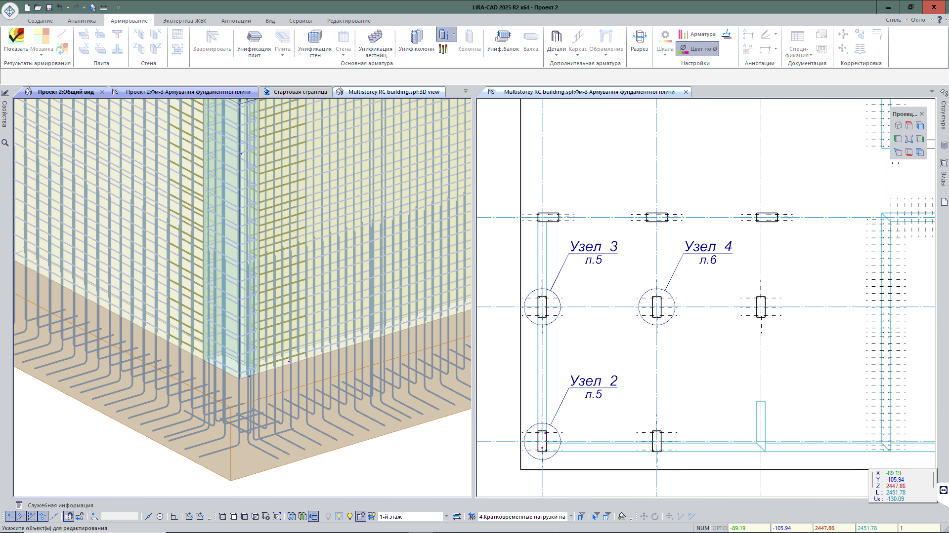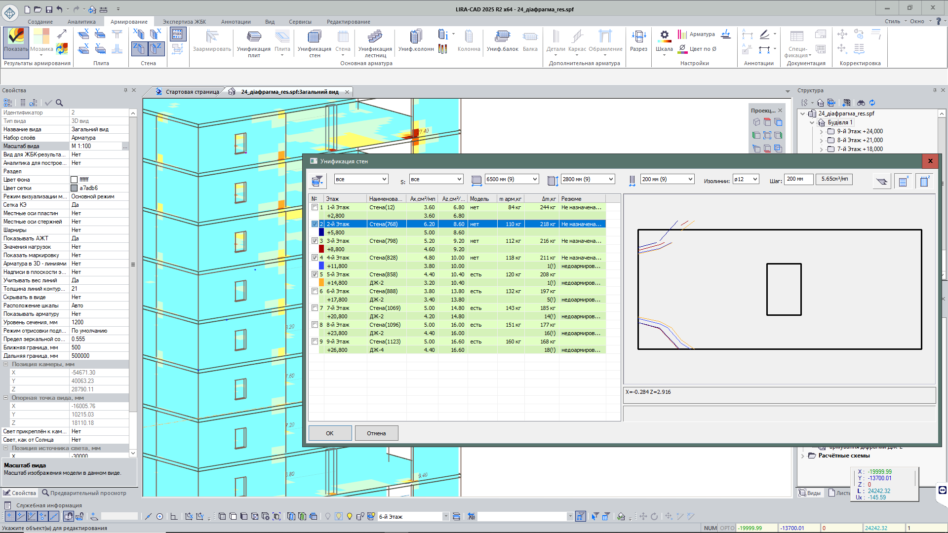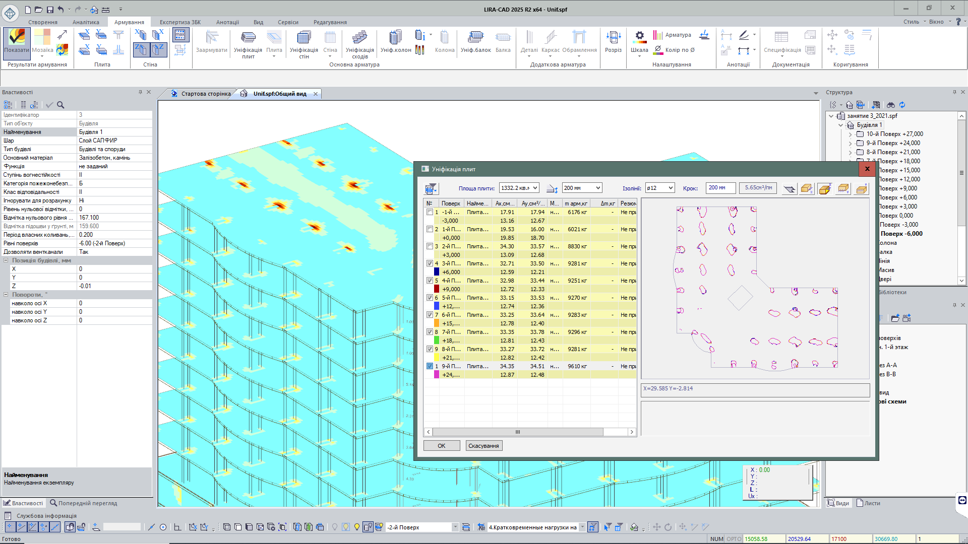 Унификация плит и стен осуществляется в автоматизированном режиме на основе результатов расчёта армирования (выполненного в LIRA-FEM), представленных в виде изополей или мозаик площади арматуры. По результатам унификации пользователь сам назначает на все экземпляры унифицированный группы одну марку. На основе этой марки программа создает модель армирования.