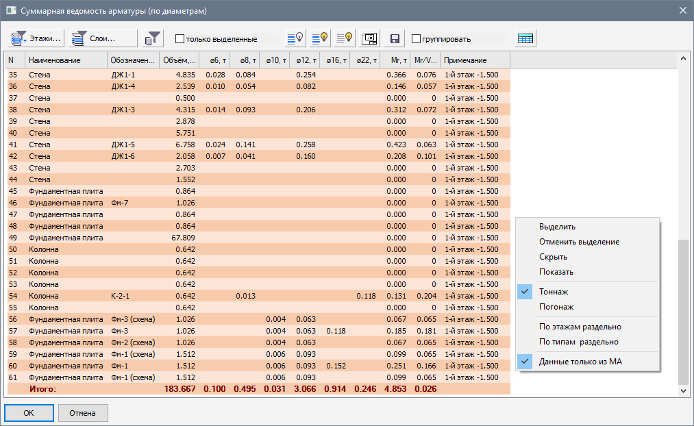 С помощью инструмента “Ведомость арматуры” можно получить детализированный расход арматурной стали по диаметрам и расход объёма бетона еще на ранних этапах проектирования. При вычислении суммарного объема бетона учитываются реальные размеры конструкций и взаимное пересечение элементов, а для суммарного объема арматуры можно выбрать представление расхода в весе или длине.