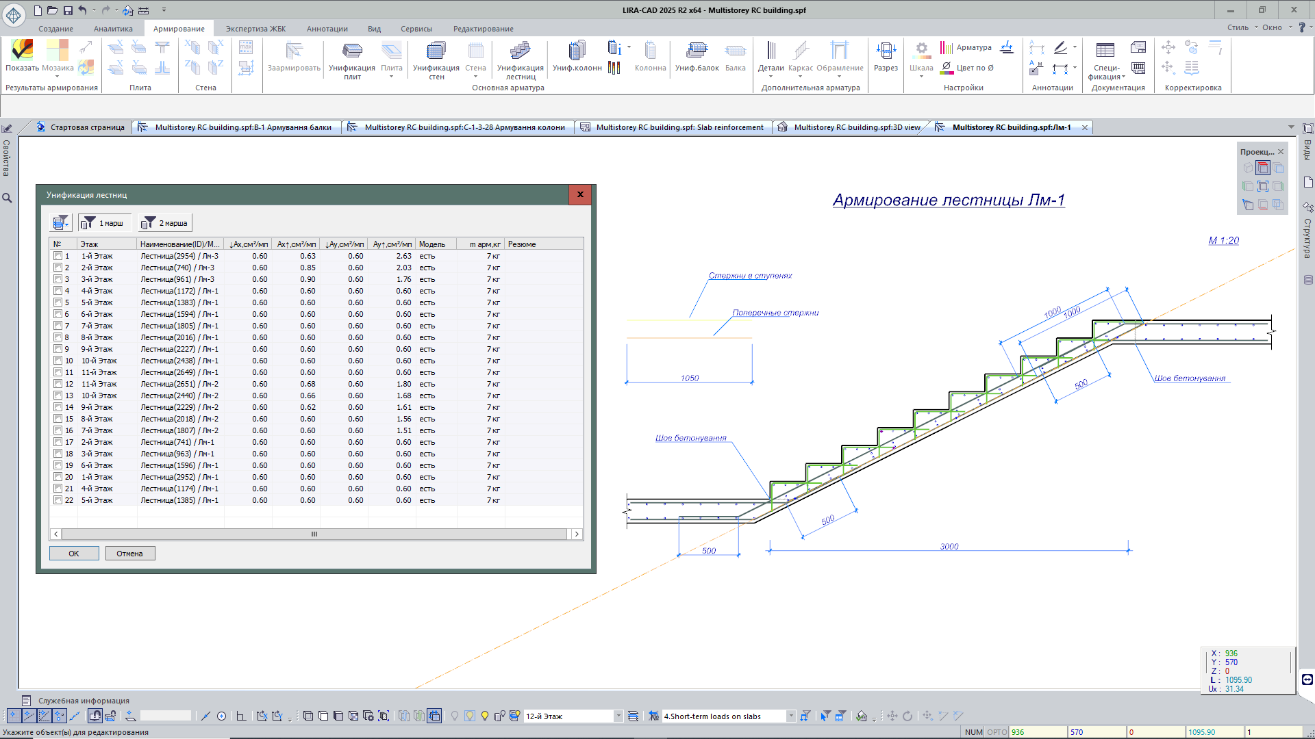 Армирование прямых и П-образных лестниц в программе выполняется на основе унификации. Конструирование осуществляется в автоматизированном режиме — формируется вид армирования с продольным разрезом марша, на котором уже отображена основная продольная рабочая и вспомогательная арматура. Программа автоматически создаёт рабочий чертёж армирования со спецификацией, ведомостью деталей и ведомостью расхода стали, избавляя пользователя от рутинных операций и ускоряя выпуск проектной документации.
