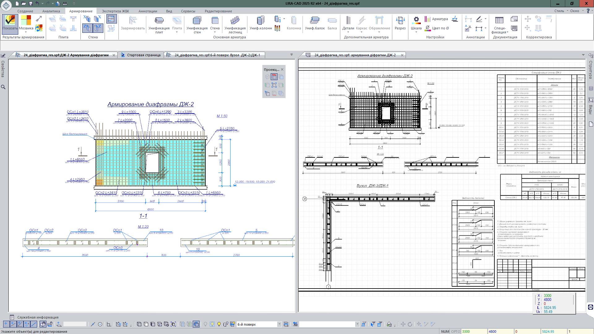 Для модели армирования стен автоматически создаются вертикальные и горизонтальные арматурные стержни с выпусками и необходимой длиной нахлеста. Зоны армирования обозначаются марками. Существует возможность выполнить продольный или поперечный разрез по стене, а также в автоматизированном режиме выполнить усиление проема или края стены.