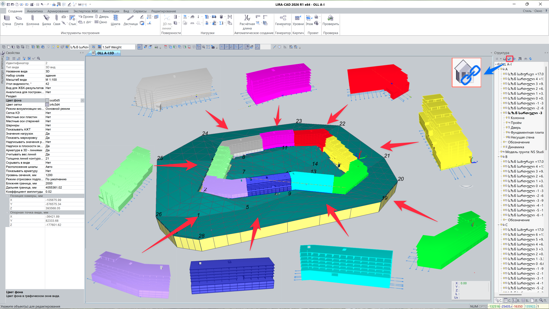 Реализовано формирование единой составной BIM-модели на основе нескольких задач с возможностью обновления подключённых зданий. Инструмент обеспечивает централизованное управление мастер-проектом, синхронизацию изменений и актуальность данных по всему объекту. Расчет выполняется по составной модели, что позволяет рассматривать здание как единую систему с учетом взаимного влияния всех подключенных частей.